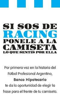 “Si sos de Racing ponele a la camiseta lo que sentís por ella“, reza la invitación de la institución bancaria en su sitio web oficial y en las publicidades que pauta para promocionar la acción. “Por primera vez en el Fútbol Argentino, un equipo saldrá a la cancha con la camiseta más votada por sus hinchas“, agrega.