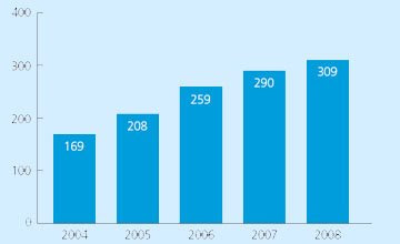 La entidad que preside Joan Laporta ha aumentado sus ingresos en los últimos cuatro años. De 169 millones en 2004 pasa a casi 309 en 2008, prácticamente el doble.