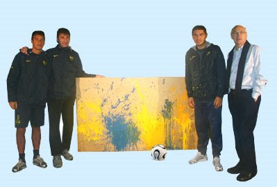 En “la Bombonerita”, los tres jugadores hicieron de sus destrezas para pegarle a la pelota un arte. Sus remates a recipientes con pintura colorearon de azul y amarillo un mural que será subastado el 14 de agosto, en el hotel Intercontinental.