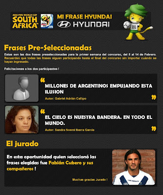 La promoción ¨Mi frase Hyundai¨, el concurso de slogans que premiará con el nuevo automóvil Hyundai i10 al ganador y con su frase decorará el micro que llevará a los jugadores de Argentina durante la copa del mundo Sudáfrica 2010, ya tiene sus primeras frases preseleccionadas.