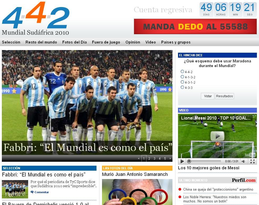 El principal es poder darle el lugar que merece un Mundial en el más estricto sentido de la palabra. Un sitio generalista, como es Perfil.com, sólo podría tocarlo en forma parcial, y el gran caudal de información que genera un espectáculo de este tipo no puede verse encorsetado por un diseño hecho para otros fines. 442 permitirá no sólo cubrir la actividad de la Selección, sino de otros equipos que nos interesan por distintas razones a los argentinos. Por ejemplo, Chile.