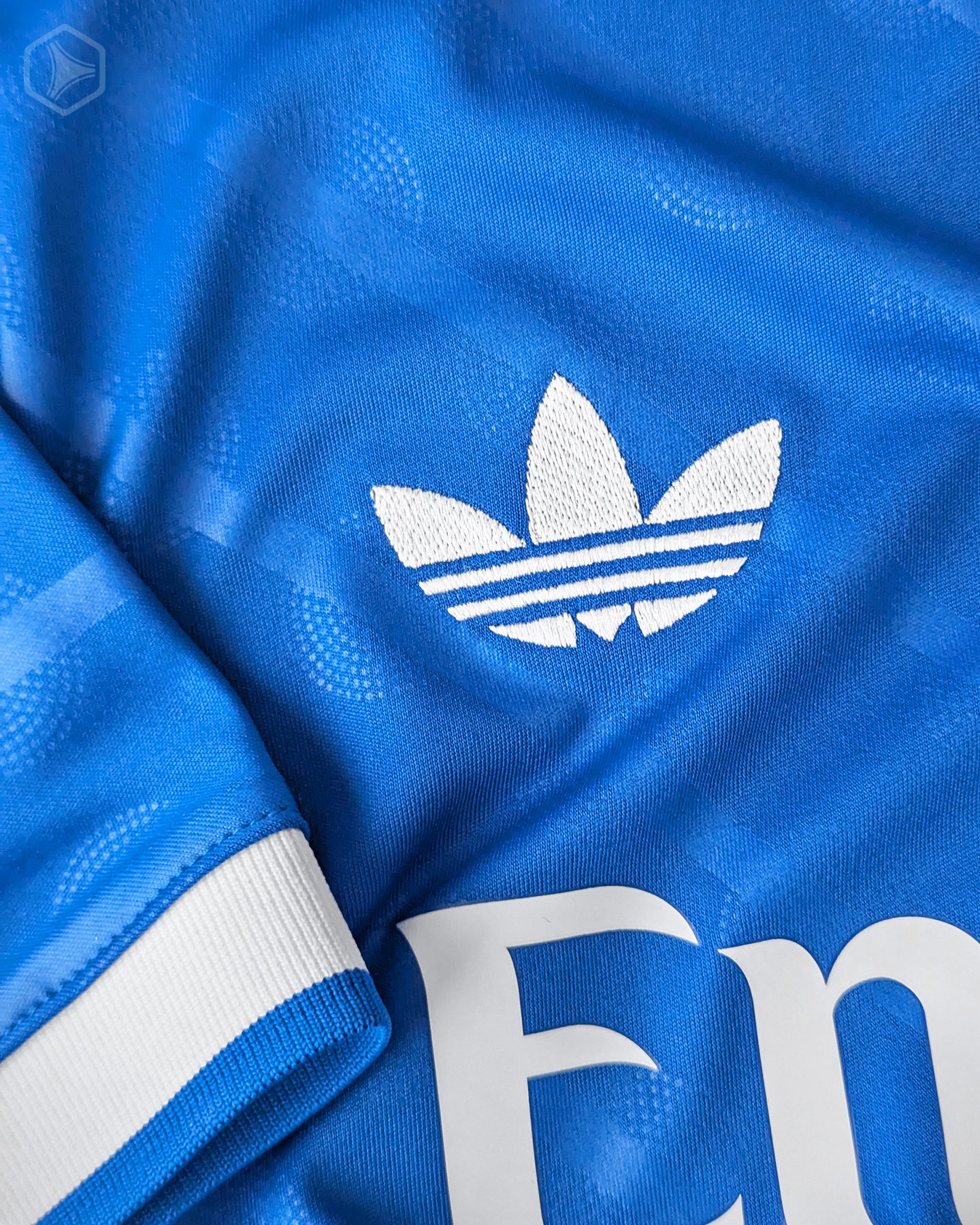 El blanco aparece como protagonista secundario, dándole vida al cuello en ‘v’, con terminación cruzada; así como también en los puños y los logos. Las tres tiras son simplemente espectaculares, replicando el efecto tipo serrucho que tienen las cajas de las zapatillas Originals. Una pinturita. Están acompañadas del tradicional logo Trefoil, que se aprecia en todos los terceros uniformes de los clubes Elite de la marca. El escudo es el tradicional, aplicado -por suerte- a todo color. En la nuca se añaden las iniciales de la institución, en amarillo.