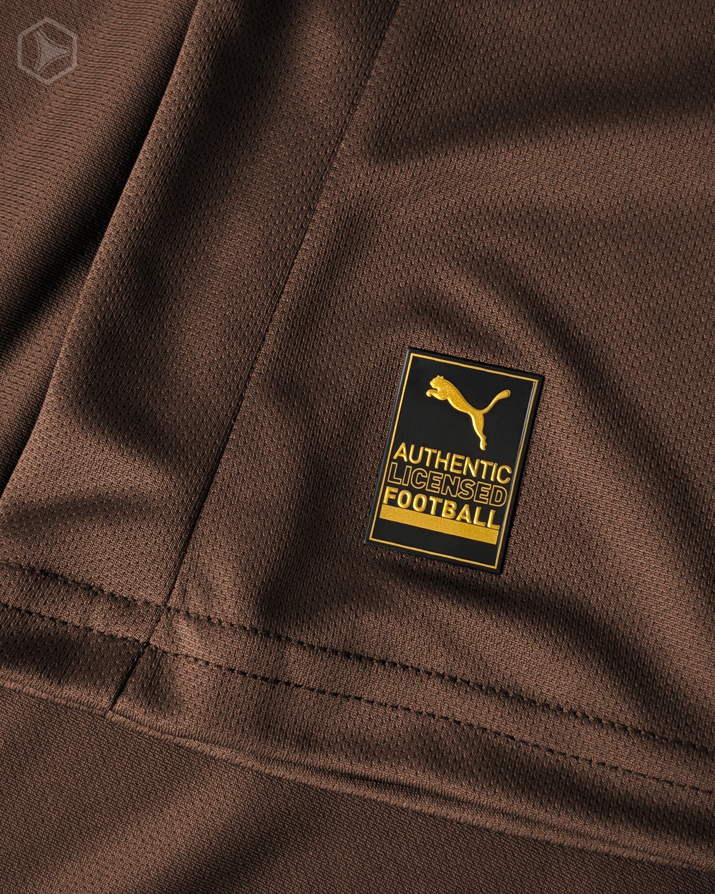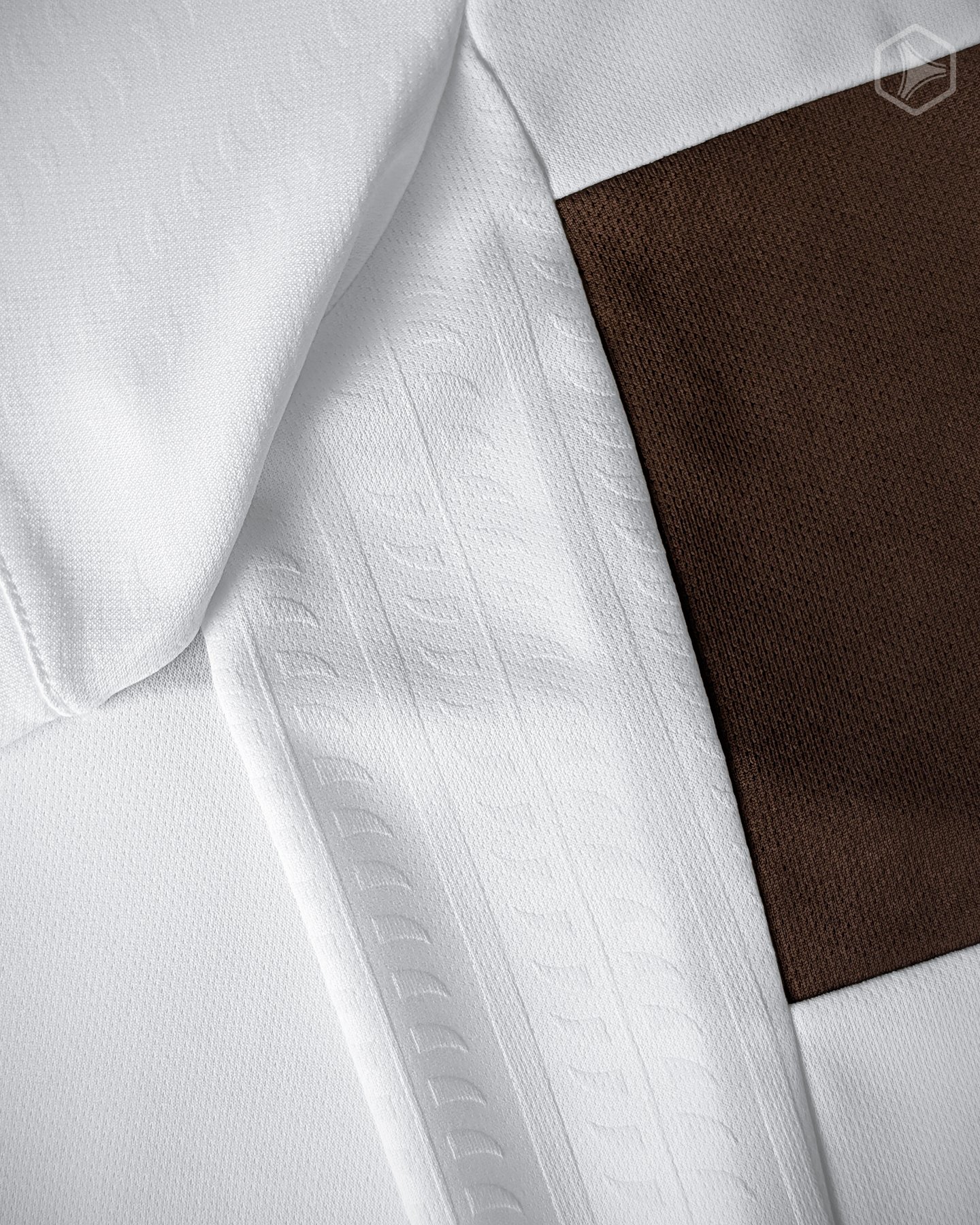 La variante de visita básicamente invierte los colores de la equipación local, teniendo al marrón como protagonista y al blanco para los detalles. Las diferencias más sustanciales están en la ausencia de la textura en las mangas y laterales; sumado a un diseño distintivo del emblema de la nuca, que tiene el mismo mensaje, pero presentado de otra forma para darle su personalidad única. Al igual que en su compañera de colección, el logo de la marca en el pecho está realizado en TPU, y tiene el jock tag de autenticidad en dorado en la cintura.