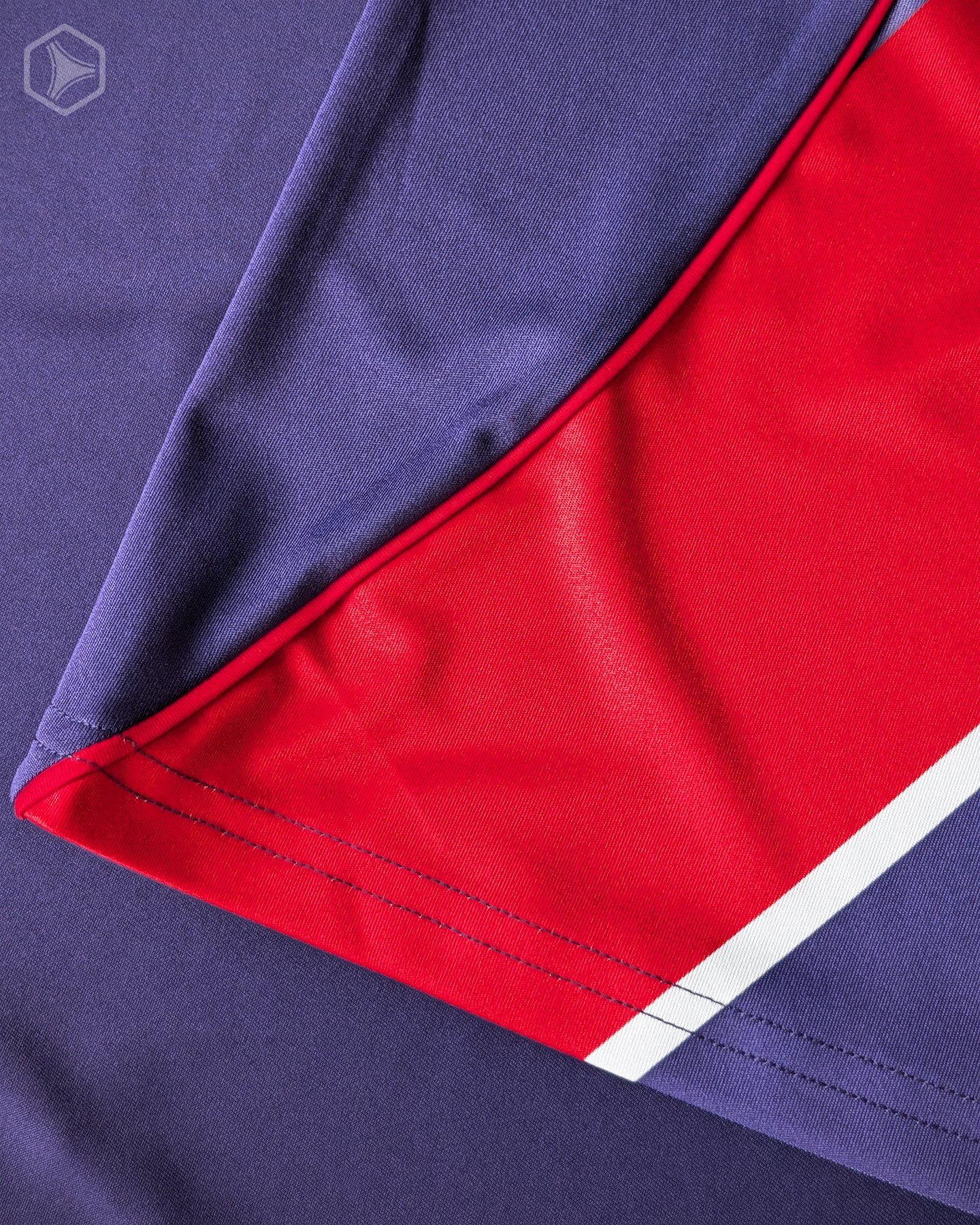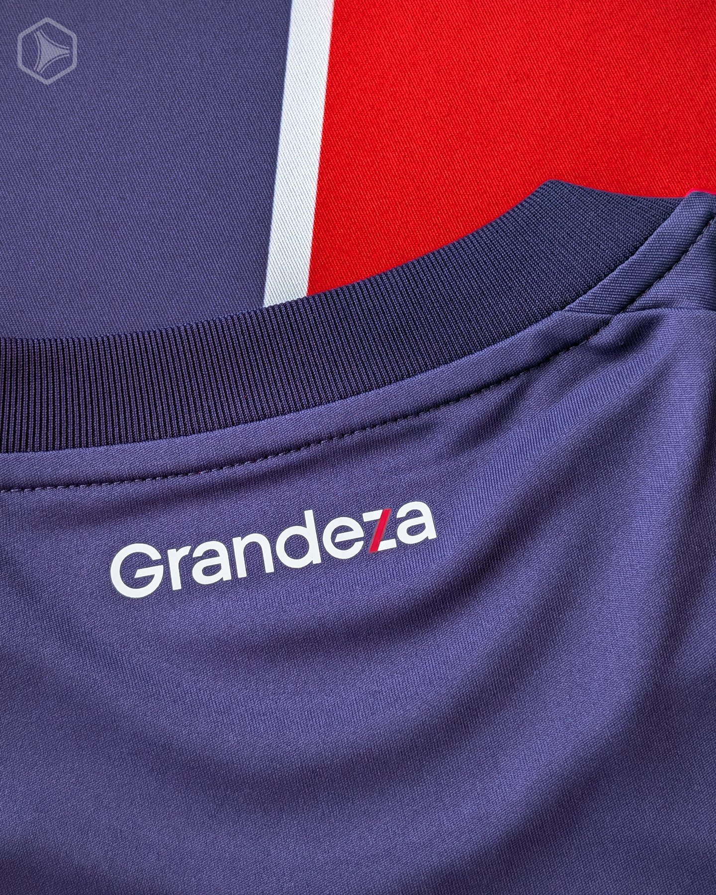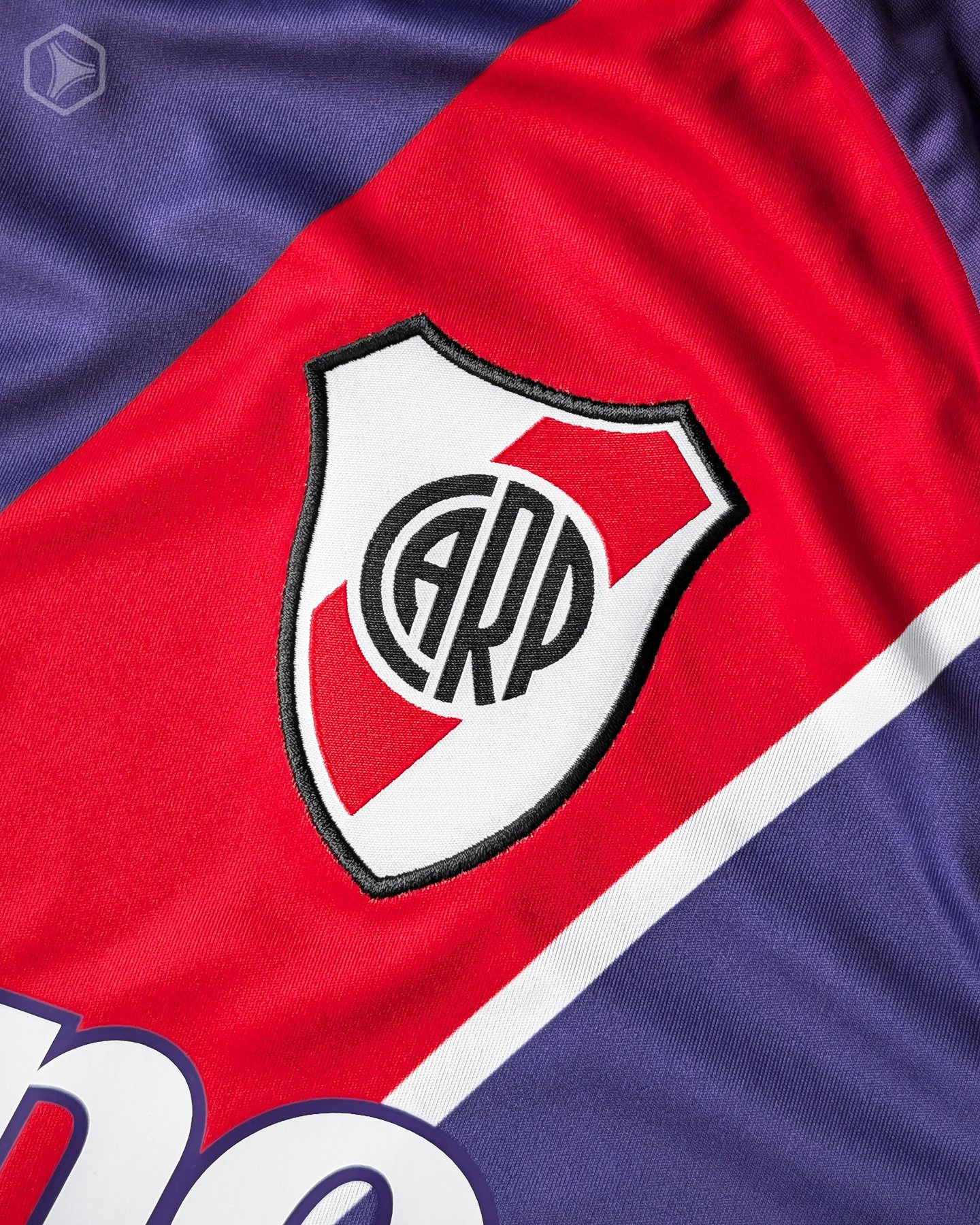 La equipación añade por primera vez la banda roja sobre la base morada, con una línea blanca divisoria necesaria para que exista contraste entre dos tonos parecidos -y un guiño a la corbata de Labruna-. Obviando los memes que la comparan con un paquete de chocolate o café (con un tono más oscuro se evitaba), no nos parece para nada malo el intento. Sí sentimos que con las tres tiras en el mismo tono oscuro de los recortes, cuello y puños, el resultado general mejoraría, pareciendo menos colorinche. En la nuca posa el “Grandeza”, eslogan que, si bien se impone hace años, nunca creó la misma afinidad con el simpatizante que el icónico “El Más Grande”.