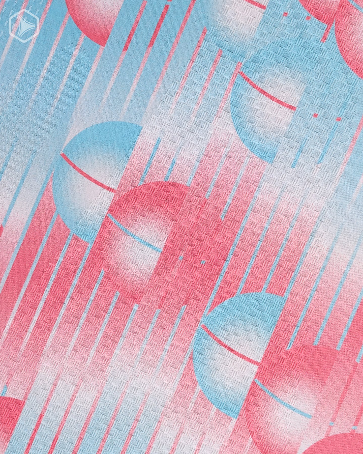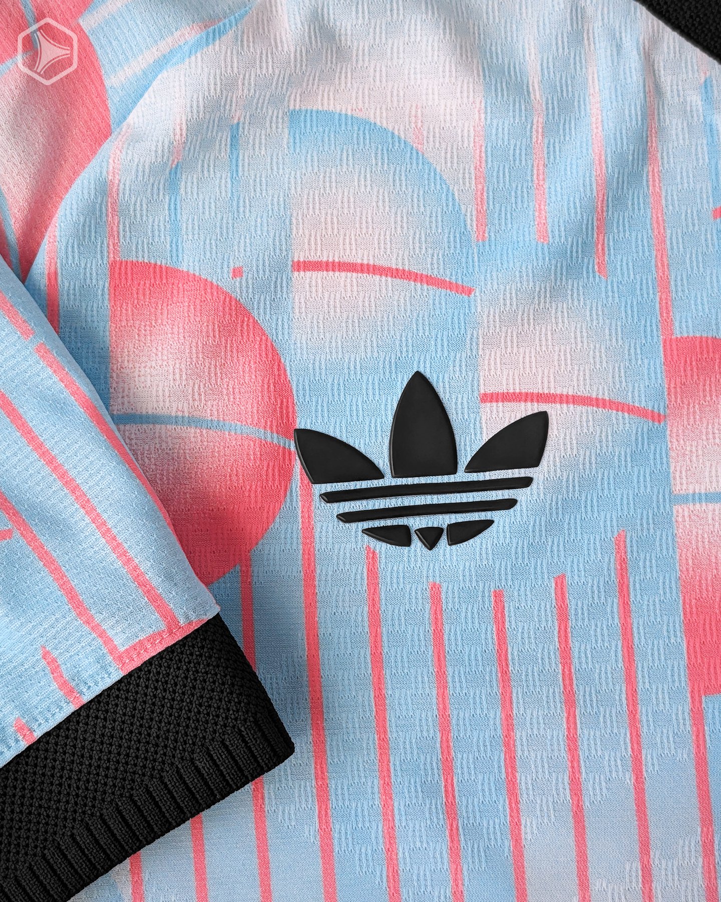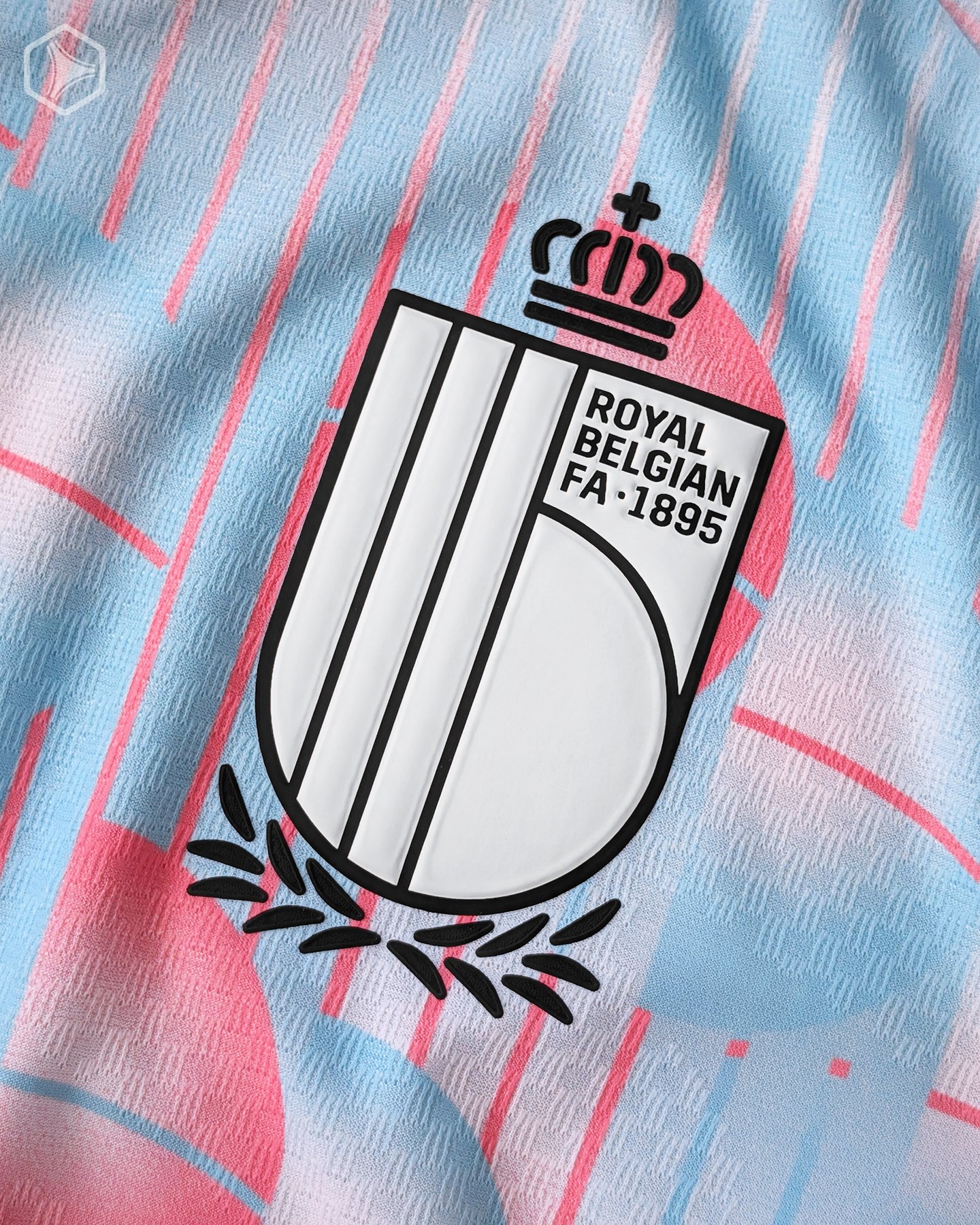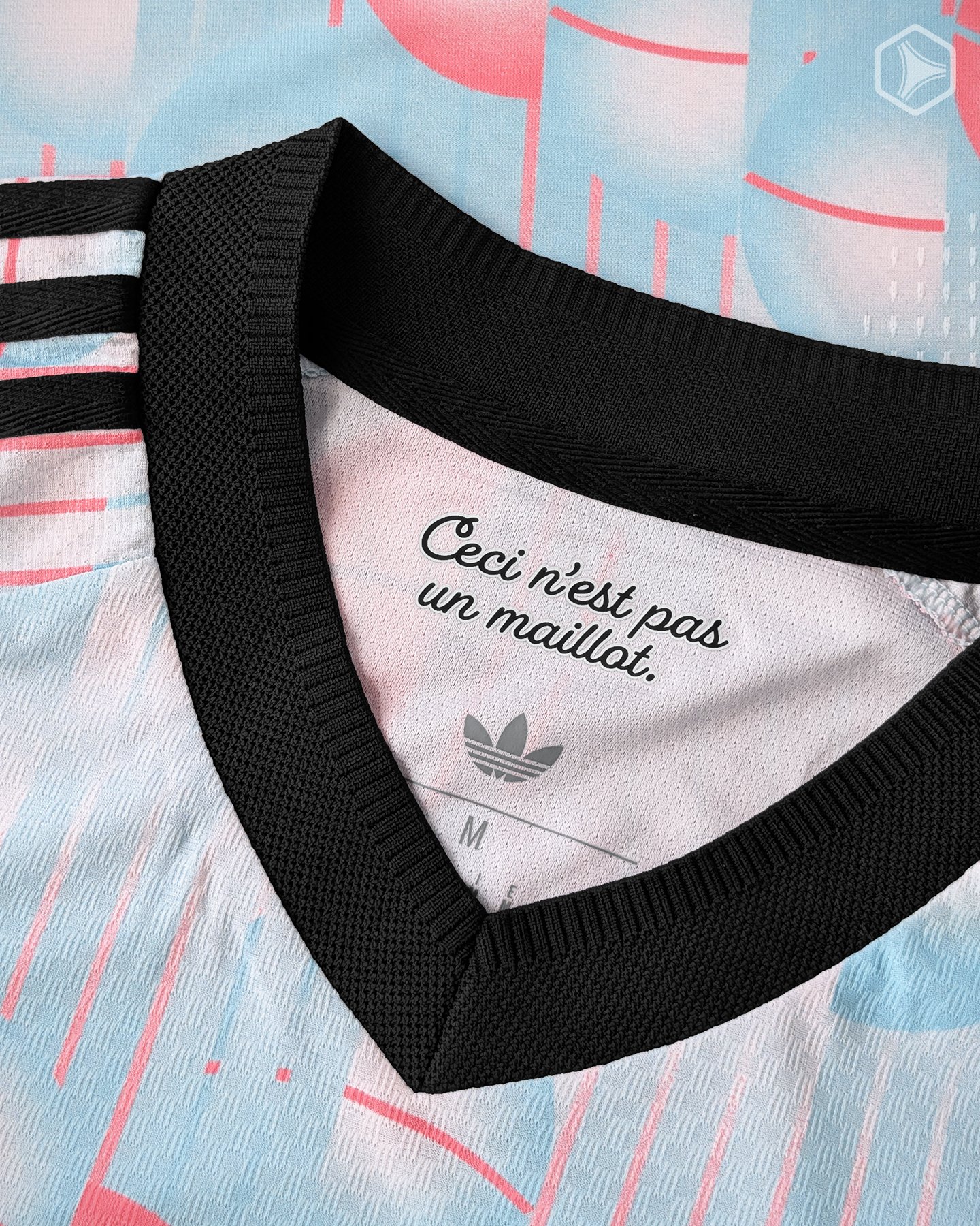 Su paleta de colores es vibrante, con buen contraste con respecto al jersey local en rojo. Combina el celeste, rosado y blanco, con una trama de líneas y formas que representan de forma abstracta el -relativamente- nuevo escudo de la federación. Al principio puede ser difícil de entender, pero una vez explicado se comprende fácil. El resultado tiene muchas vibras de fines de los 80 y principios de los 90, comparable a las icónicas equipaciones de Alemania y Países Bajos. La identidad está aplicada en blanco y negro, adaptándose a la cromática general. Como detalle final, se añade la frase “Ceci n’est pas un maillot.” (‘Esto no es una camiseta’) en el interno del cuello. Brillante.