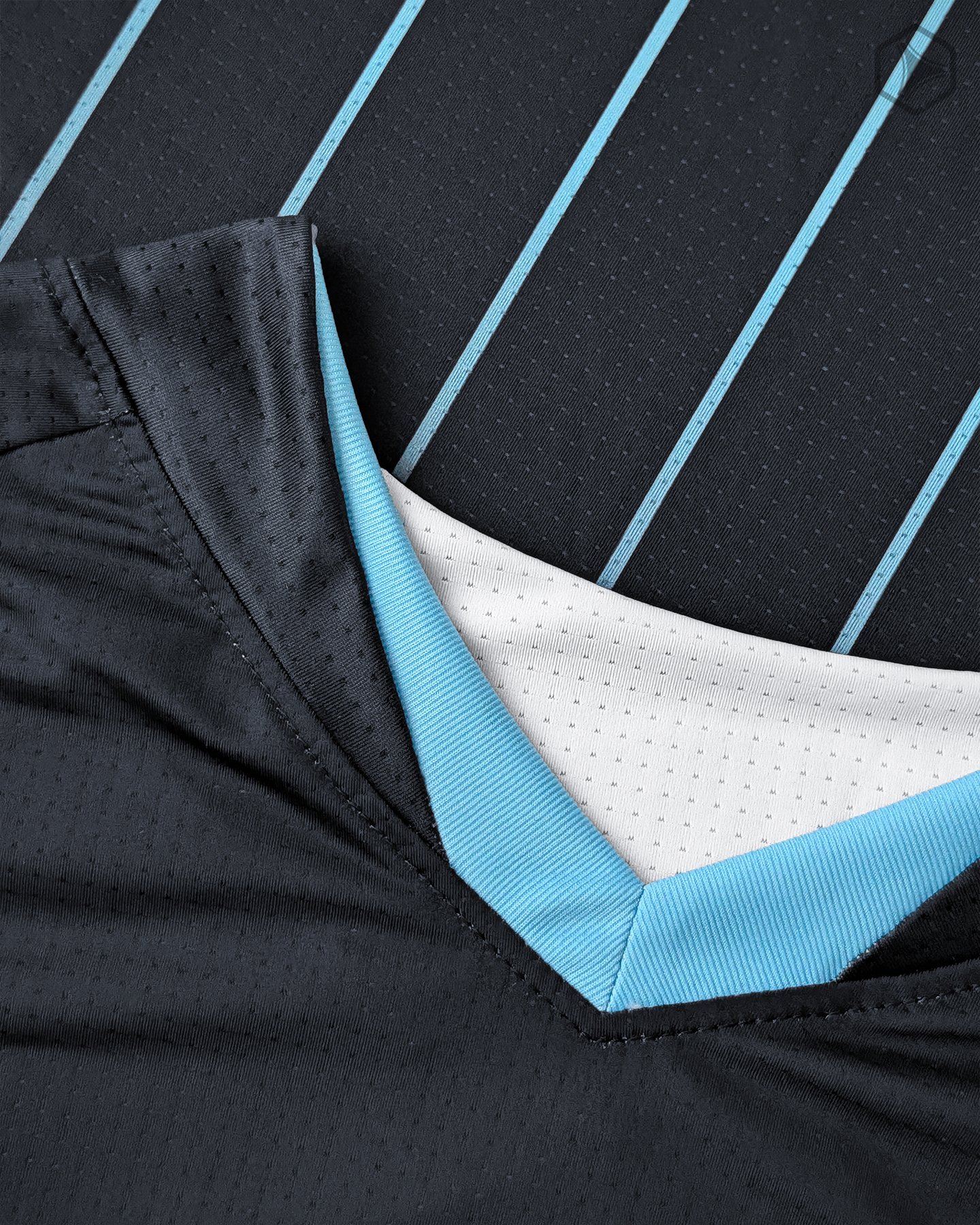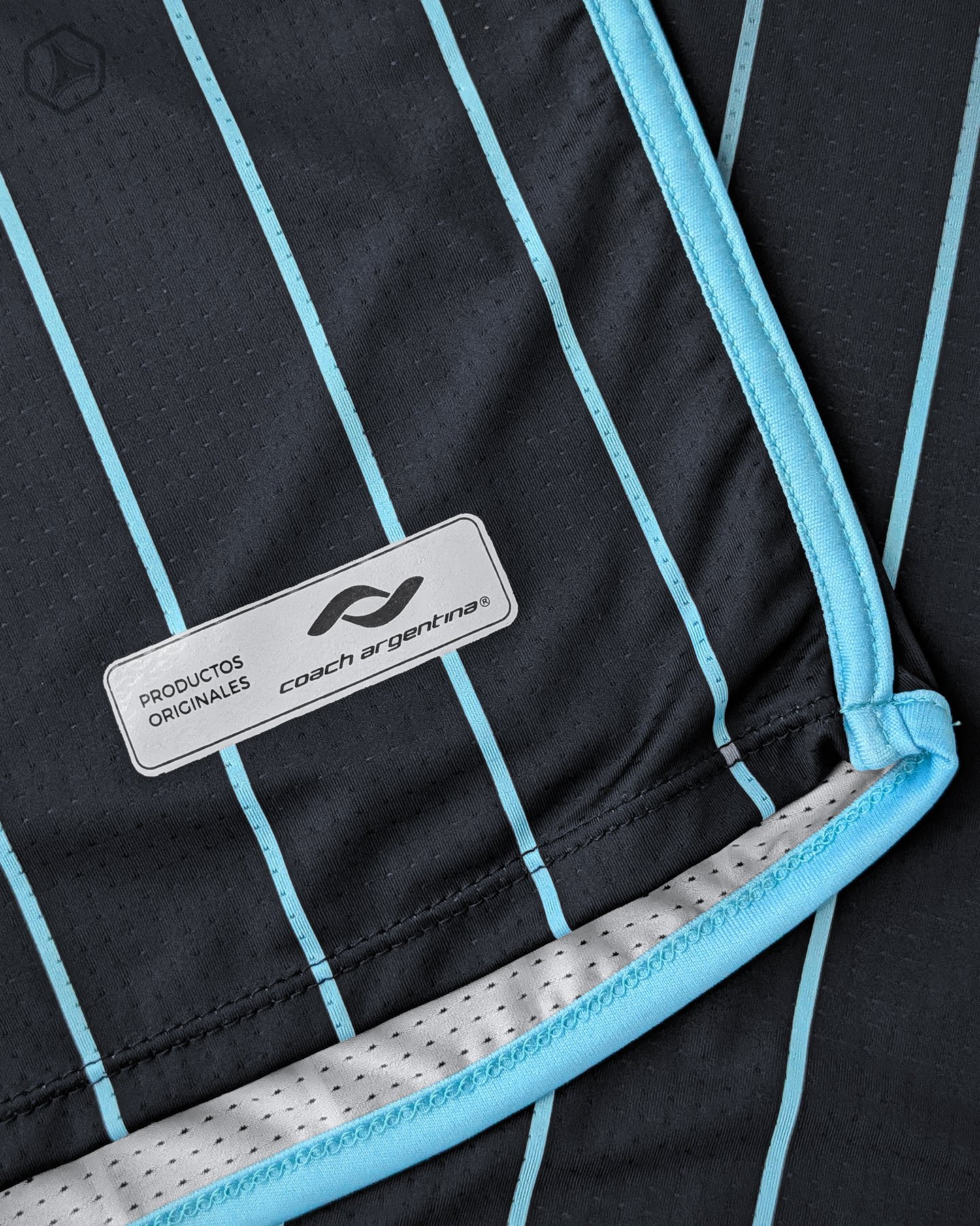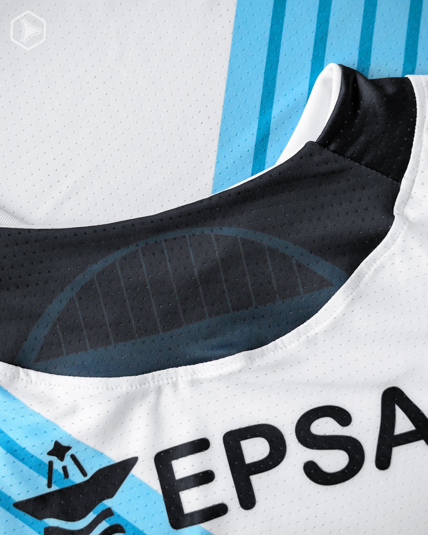 La casaca alternativa mantiene la misma paleta de colores, pero -lógicamente- en otro orden. El azul marino es el protagonista, acompañado de unos finos pinstripes celestes que se desvanecen en degradé. Una propuesta ciertamente elegante, que nos da vibes de traje de la mafia. El celeste decora los mismos rasgos del template que en el home kit: la franja laterales, las axilas y los laterales del cuello. En la nuca se sublima el mismo detalle con el arco del Conti. Se repite también el mismo escudo y el jock tag de auntenticidad.