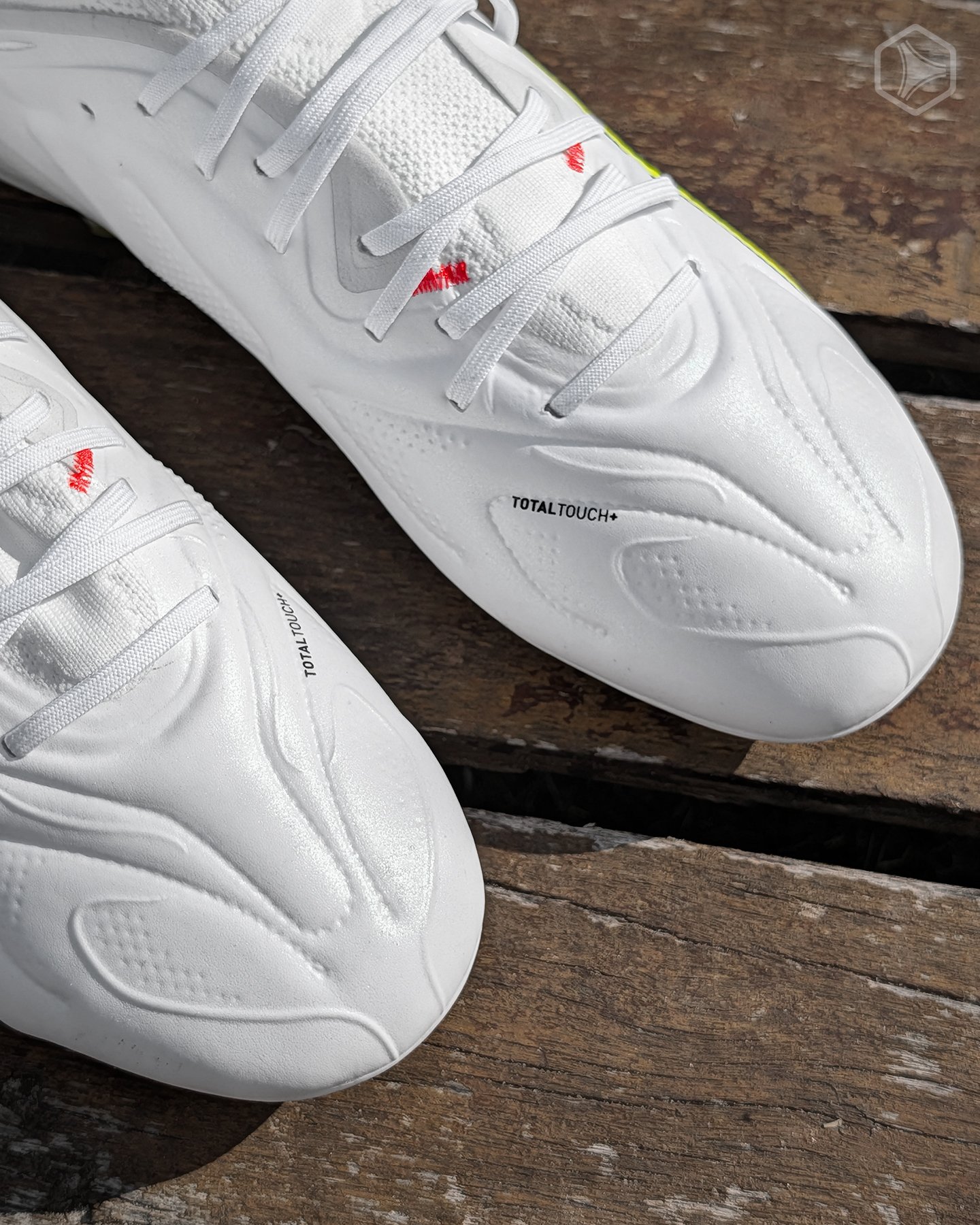 La capellada sintética TotalTouch+ es extremadamente blanda desde el primer uso, buscando replicar las características del discontinuado cuero de canguro. Se adapta muy bien al pie (y lo hará más con cada uso). Se le suman insertos en el interior con más material, que amortiguan cada toque con el balón. Suman varios puntos en comodidad, aunque no brinda esa cercanía entre pie y pelota que a veces es bienvenida (para eso habrá que buscar otros modelos). En zonas estratégicas del upper añade una textura en relieve que ayuda a mejorar aún más el grip que se tiene con el esférico. No tienen exactamente la misma performance que la piel natural, pero te hace no extrañarla. En esta materia cumple con creces, tal como era de esperarse en un calzado de este tipo.